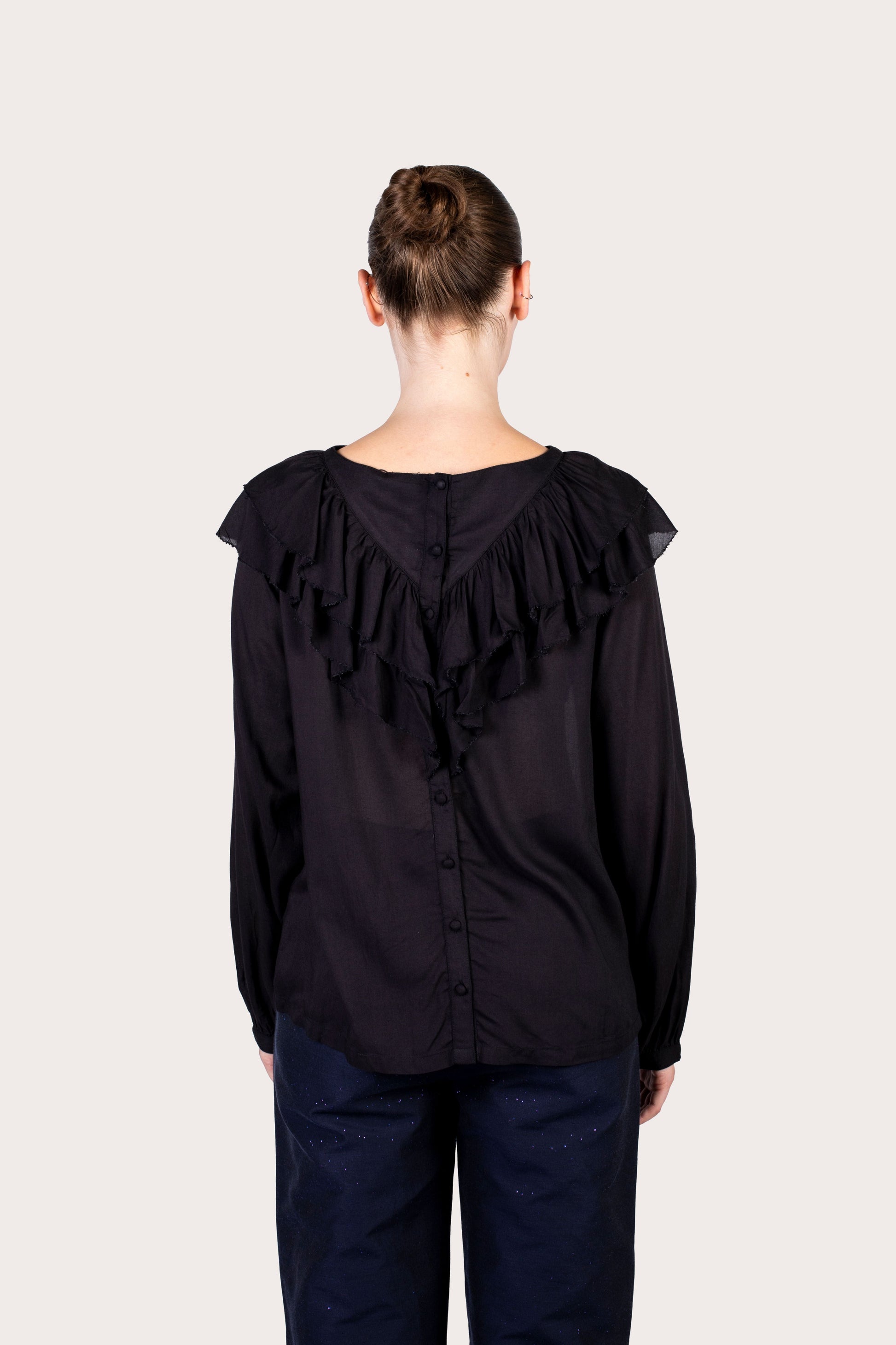 Apportez une touche d’audace à votre dressing avec la Chemise Elena Black, conçue en 100% fibre de pétales de rose bio pour allier confort et respect de l’environnement. Son design élégant, marqué par des manches génereuses et un col volant, invite à une allure unique qui ne passe pas inaperçue. Osez le style tout en douceur et faites sensation à chaque sortie avec cette pièce exclusive disponible chez Lo Neel.
