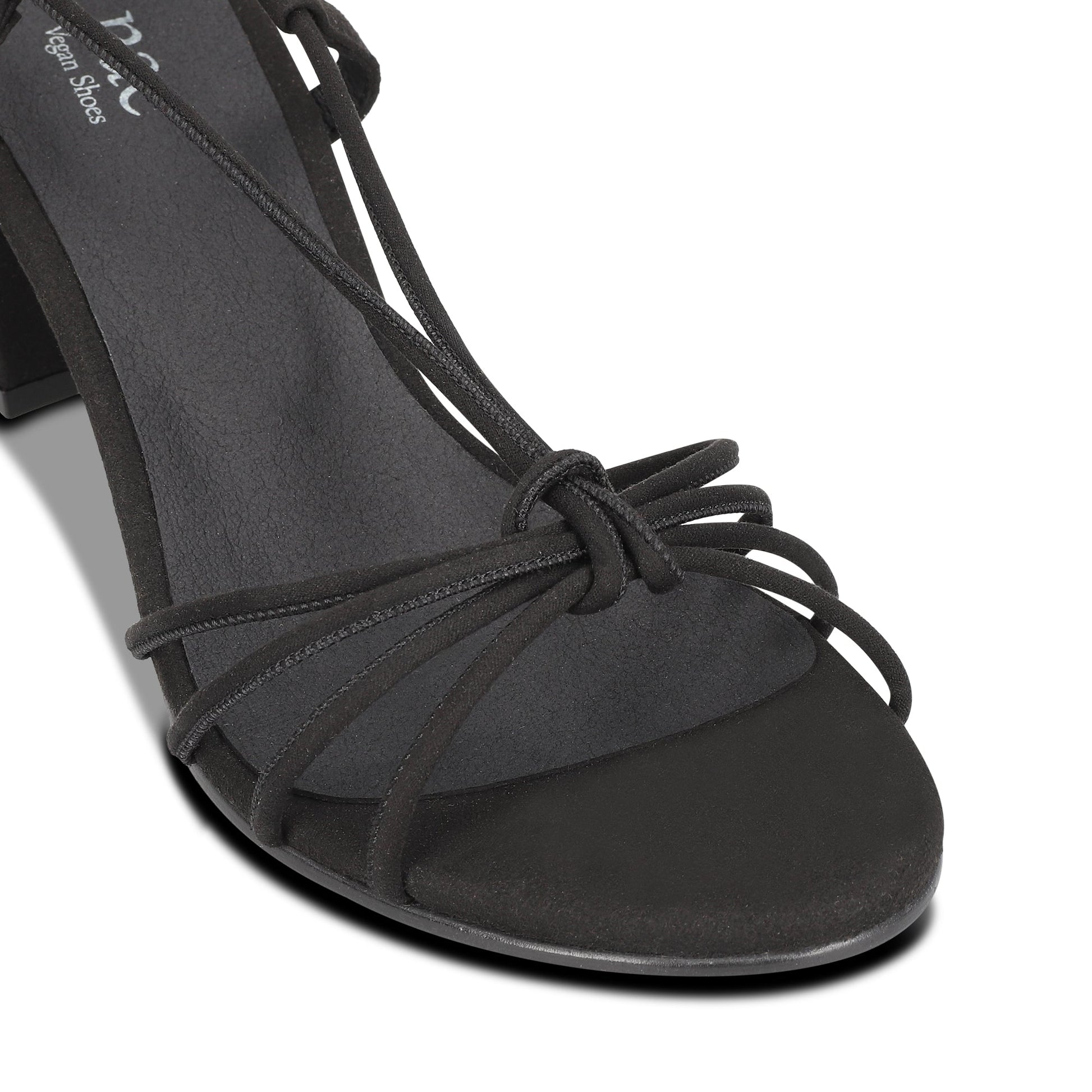 Introducing Holly Black: women's heeled vegan sandals featuring ankle laces and a suede-like vegan leather lining—an embodiment of sustainability, innovation, cruelty-free craftsmanship, and durability. Available online, these sandals offer a fresh, open, and versatile design, seamlessly complementing dresses or jeans. Their solid pattern, coupled with a suede-like effect, strikes an aesthetic balance, exuding a sober yet stylish allure. Crafted from hypoallergenic, toxin-free materials, they prioritize breathability to prevent sweat and suffocation, while their antimicrobial properties combat unpleasant odors. The moisture-wicking EVA foam insole and minimal stitching in direct contact with the foot ensure friction-free comfort. These sandals boast a sizable heel for stability and arch support, delivering comfort and allure on warmer days, all while respecting the environment in their creation.
