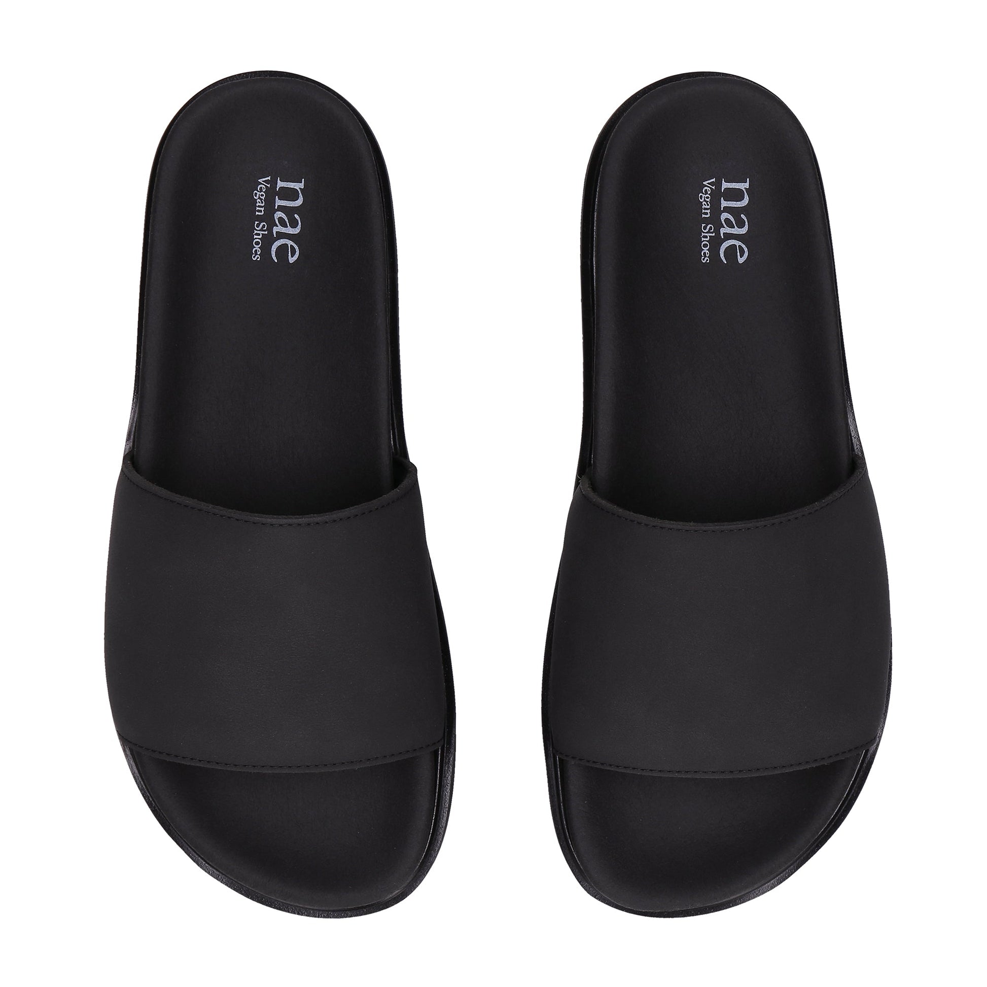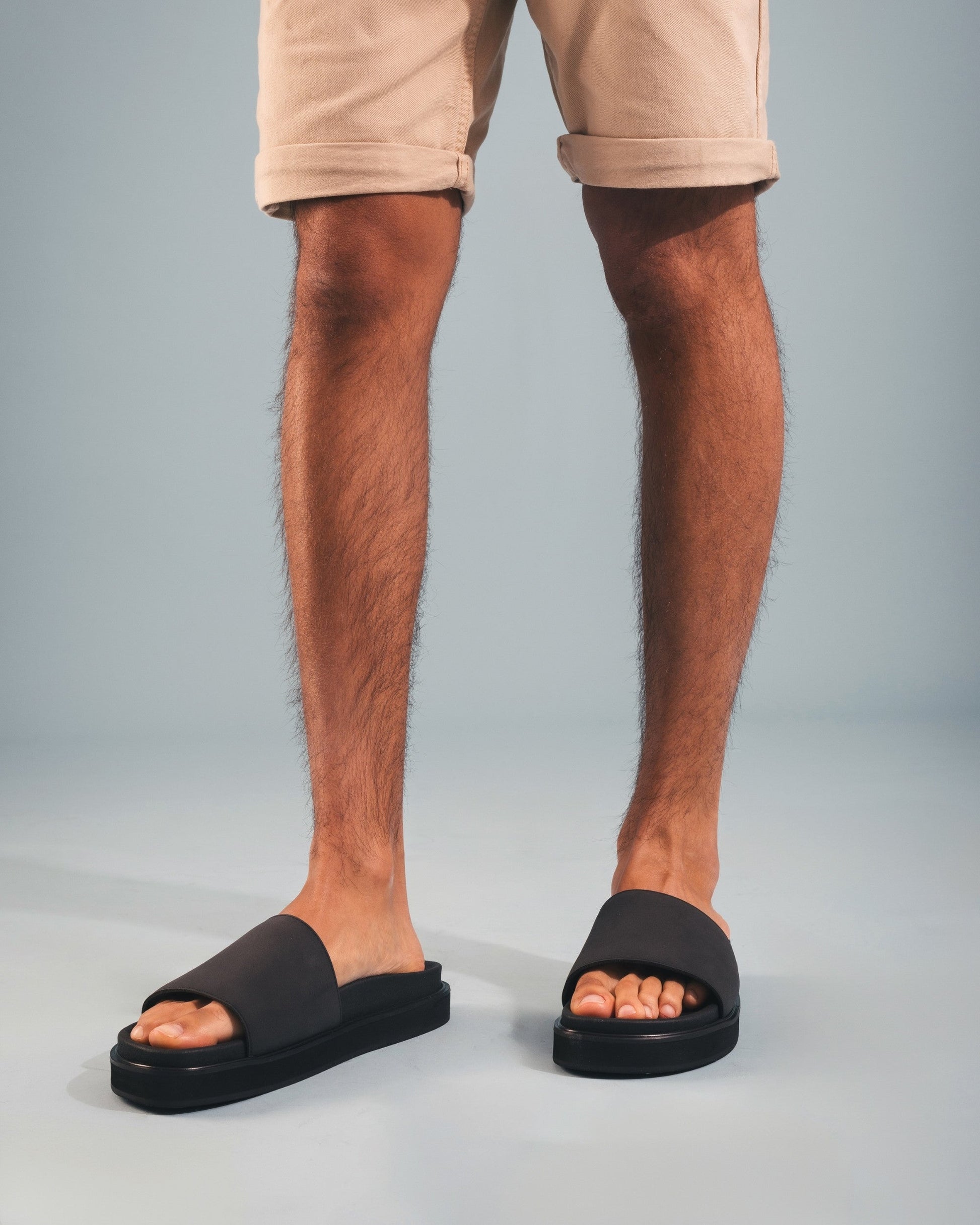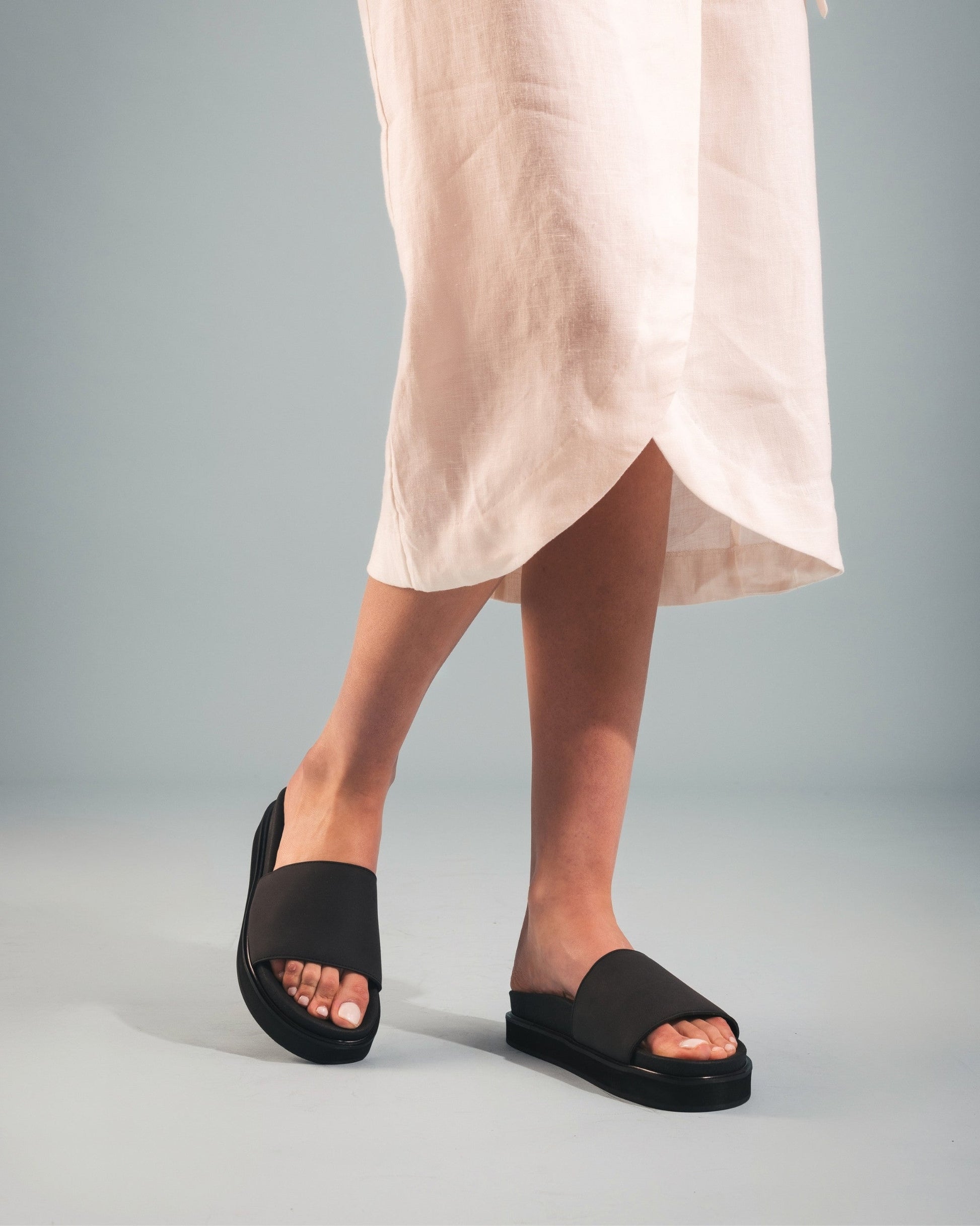 Okina Black vegan sandals are handcrafted in Portugal with eco-friendly microfibers. Featuring a bold 2 cm platform, a wide 8 cm strap at the front, and a 1 cm sole, these slip-ons offer both style and comfort. Perfect for a modern, sustainable wardrobe, they combine durability with a minimalist aesthetic.