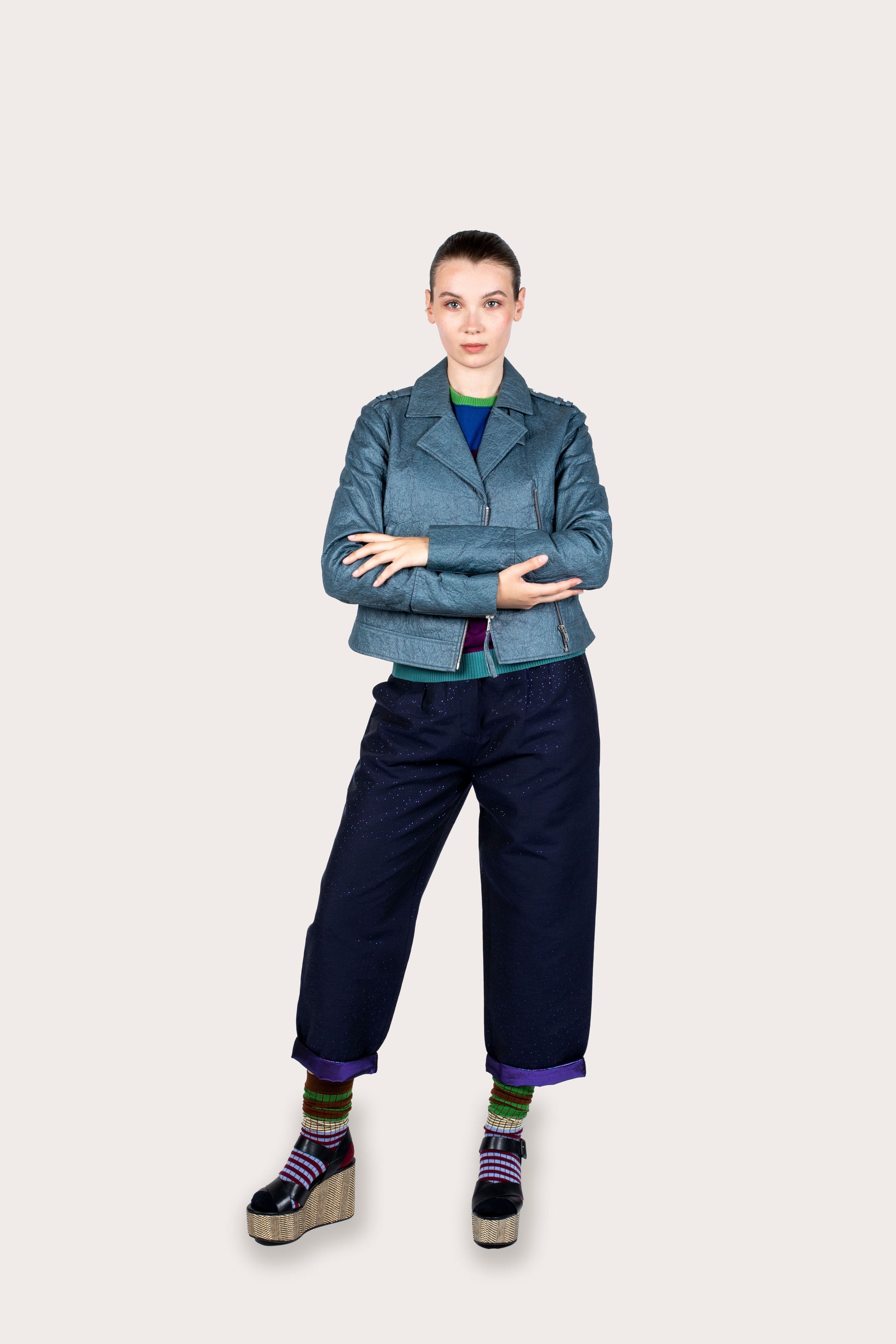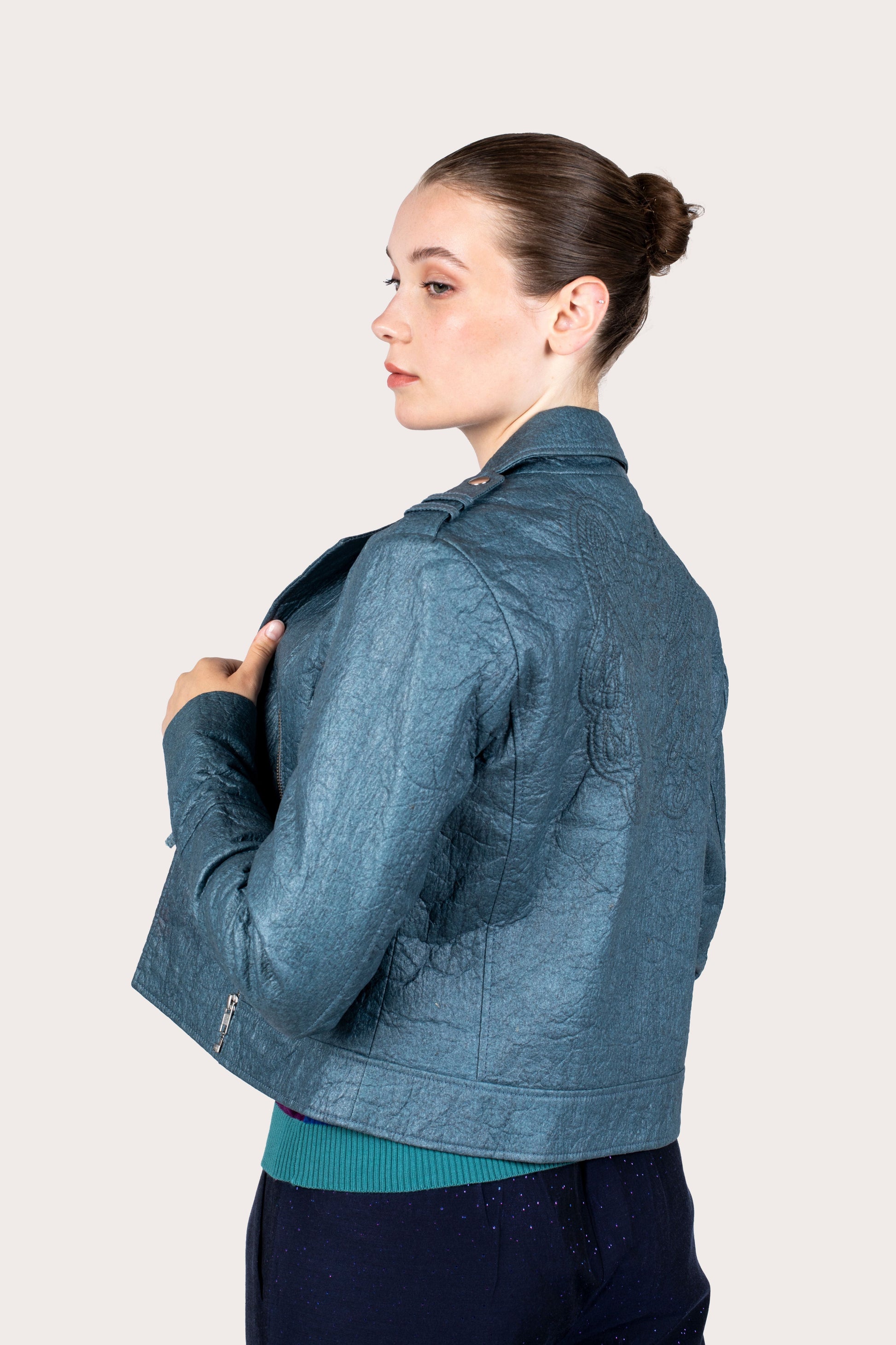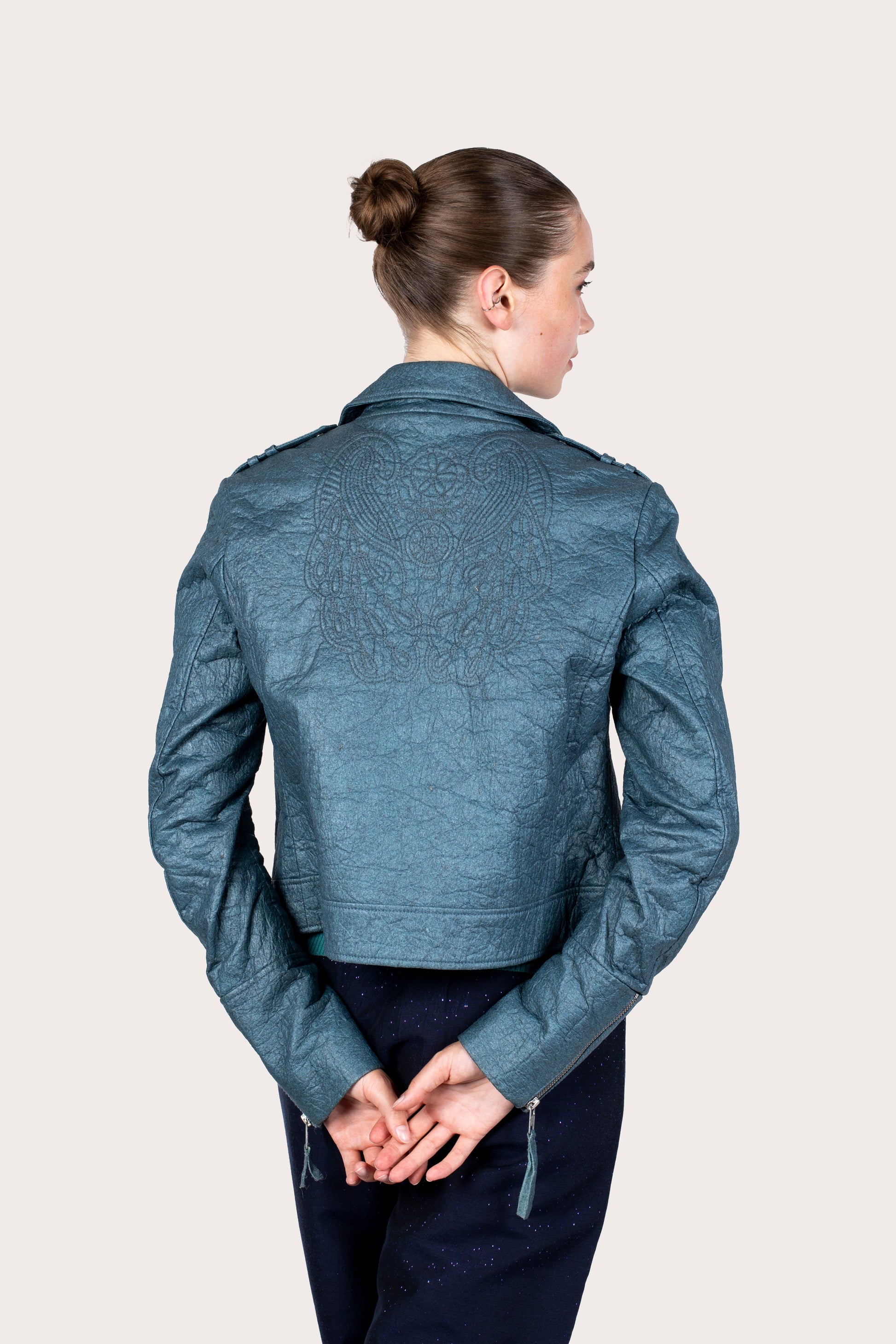Le perfecto Ananas Blue est créé à partir de la fibre d’ananas, une matière végane à l’aspect de cuir, certifiée PETA. Les broderies, réalisées à la main, sont embossées dans la matière au dos de la veste grâce au savoir-faire ancestral indien.