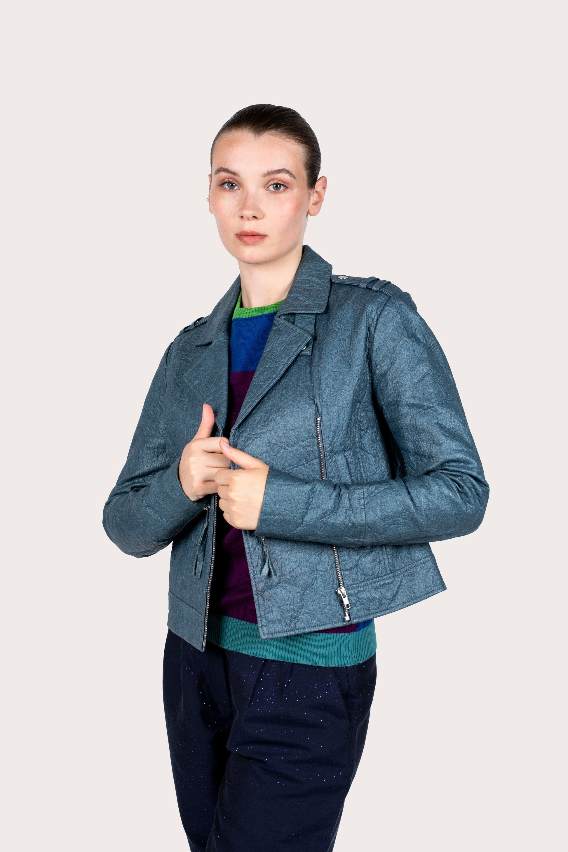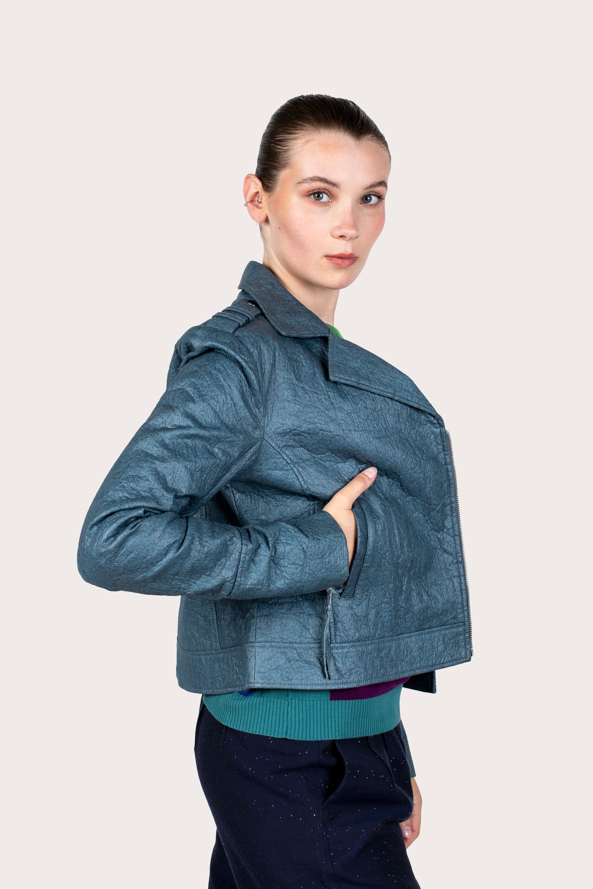 Le perfecto Ananas Blue allie innovation végétale et savoir-faire artisanal. Confectionné en fibre d’ananas certifiée PETA, ce cuir vegan se distingue par son aspect froissé, moderne et raffiné. Les broderies, embossées à la main au dos de la veste selon des techniques ancestrales indiennes, apportent une signature unique et élégante à ce classique revisité. Cintré, il structure la silhouette tout en offrant une pièce durable et audacieuse, emblématique du vestiaire LO NEEL.