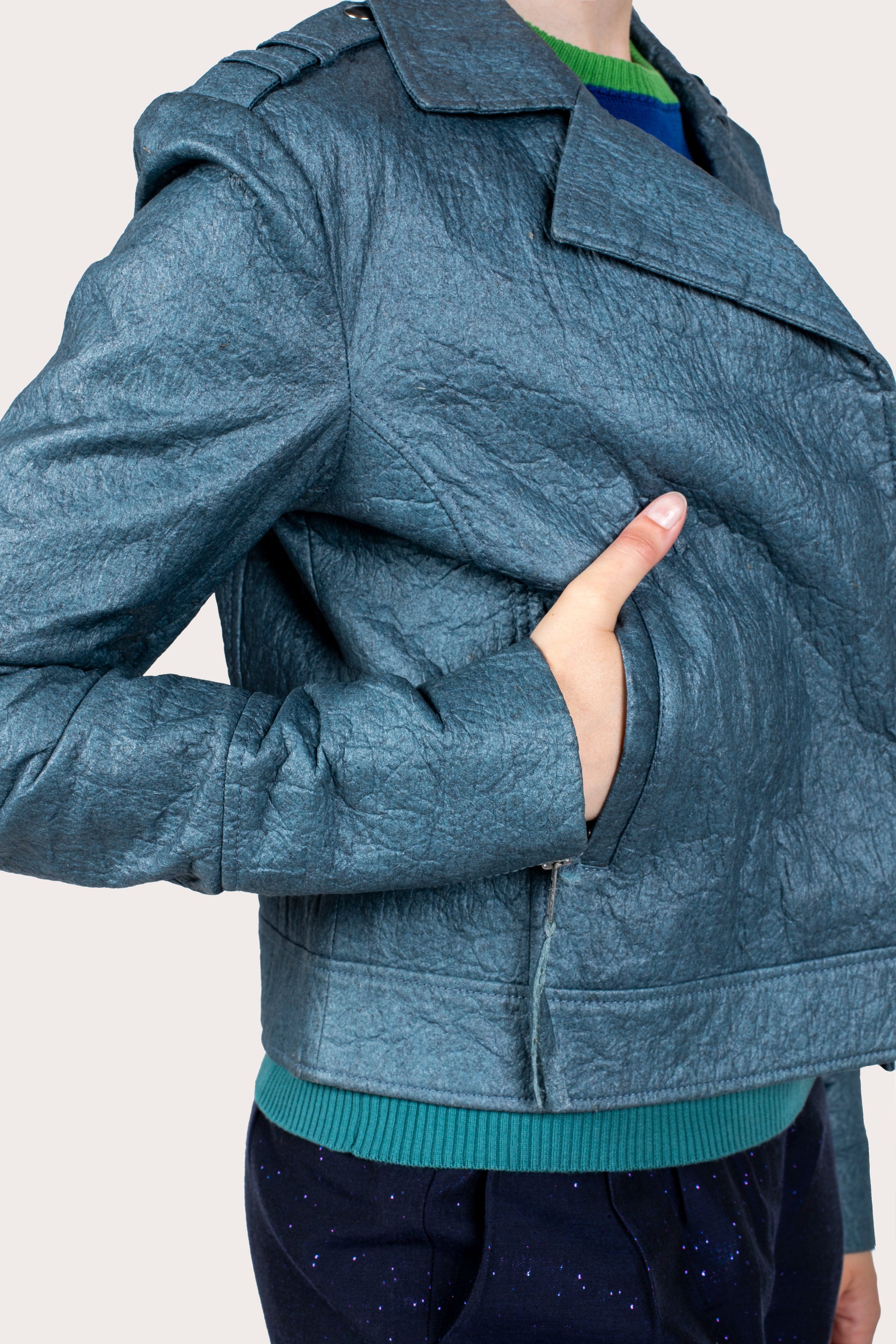 Le perfecto Ananas Blue révolutionne le style avec sa fibre d’ananas vegan, certifiée PETA, au look cuir froissé unique. Ses broderies embossées à la main, héritage du savoir-faire indien, insufflent une audace artisanale à cette pièce iconique. Cintré et moderne, il affirme une silhouette forte et originale, parfaite pour ceux qui osent se démarquer avec élégance. Un vestiaire durable et avant-gardiste signé LO NEEL.