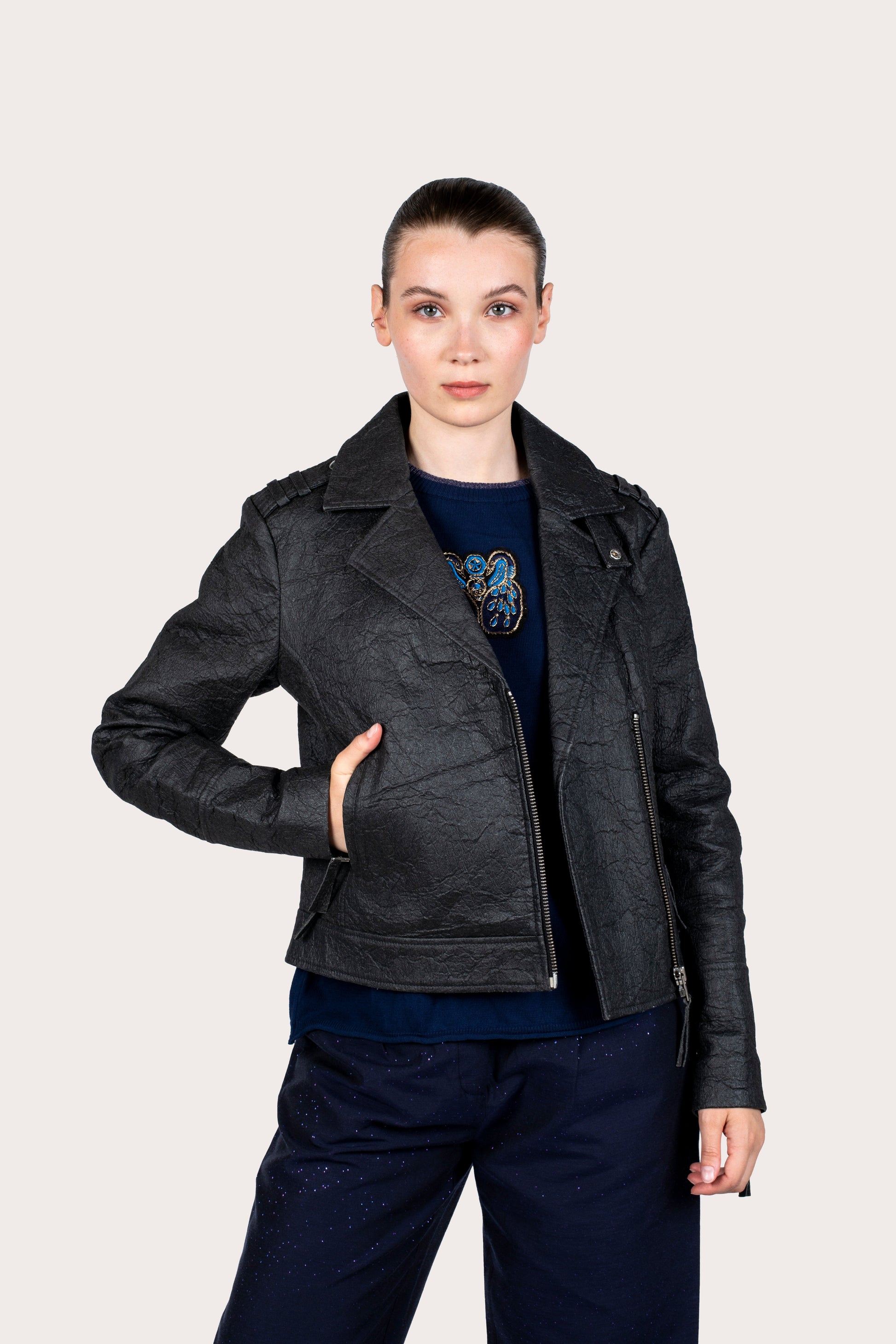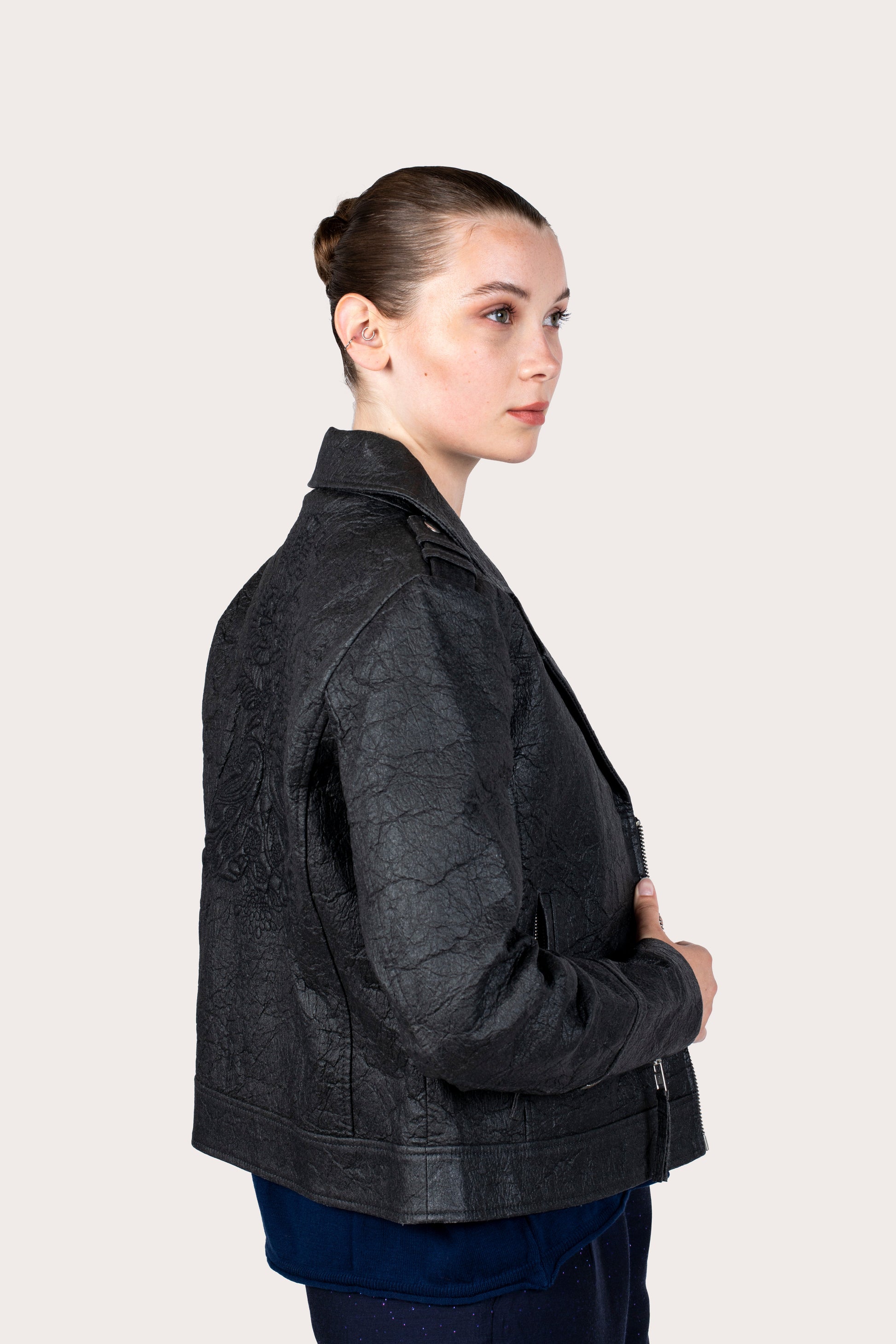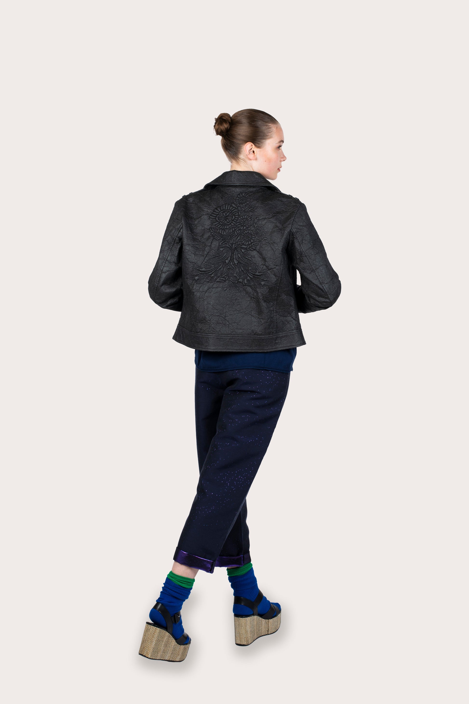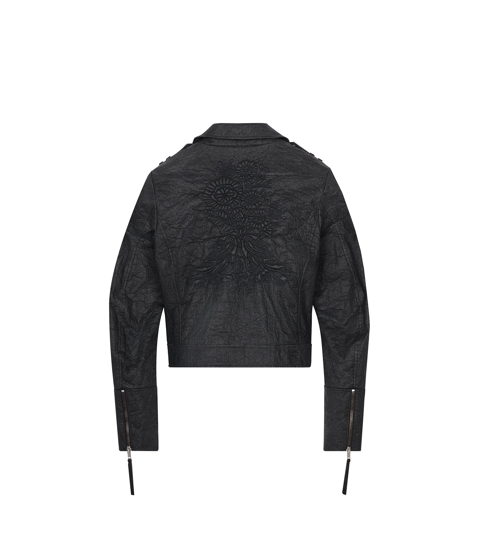 Le perfecto Ananas Charcoal est créé à partir de la fibre d’ananas, une matière végane à l’aspect de cuir, certifiée PETA. Les broderies, réalisées à la main, sont embossées dans la matière au dos de la veste grâce au savoir-faire ancestral indien.