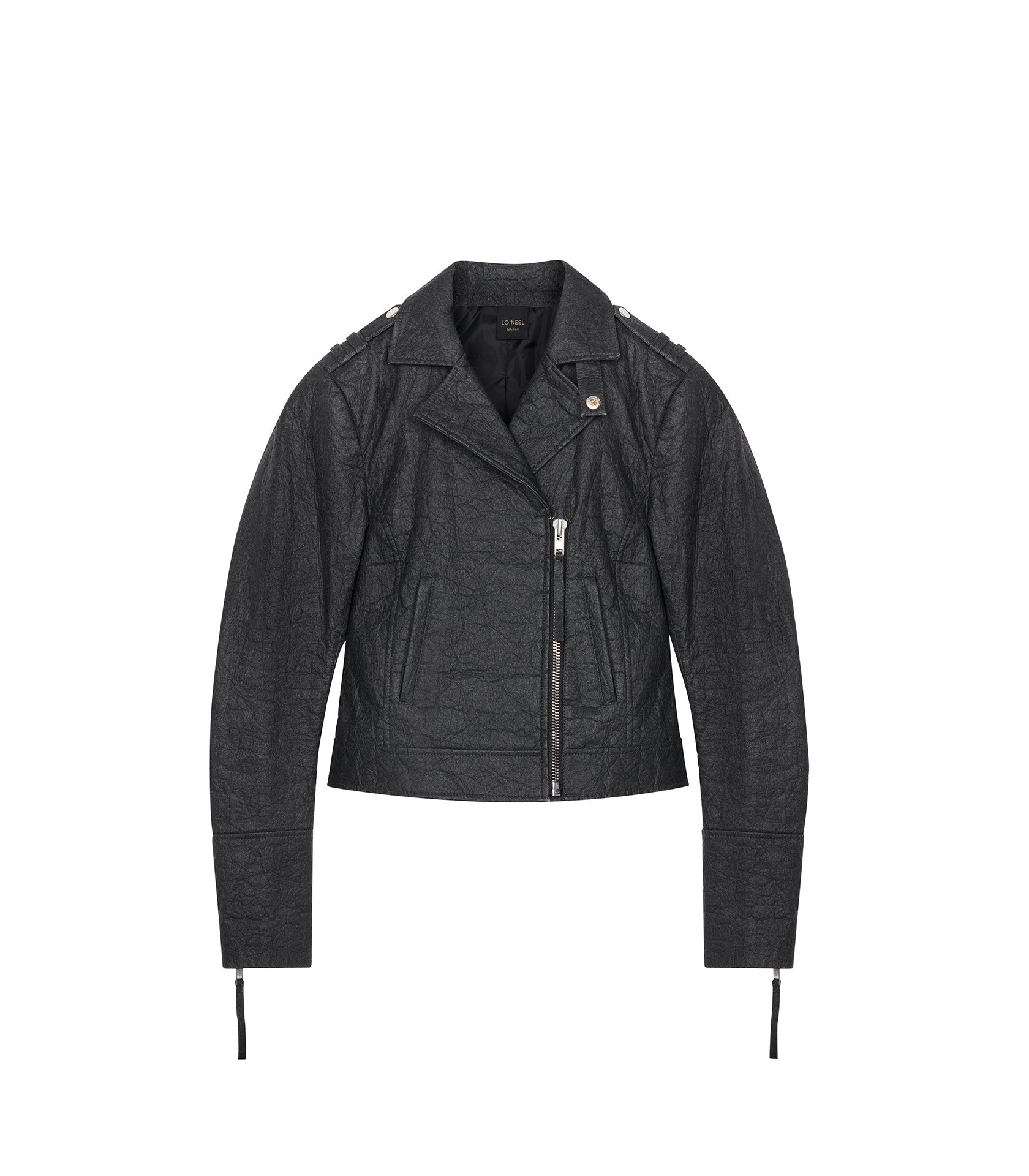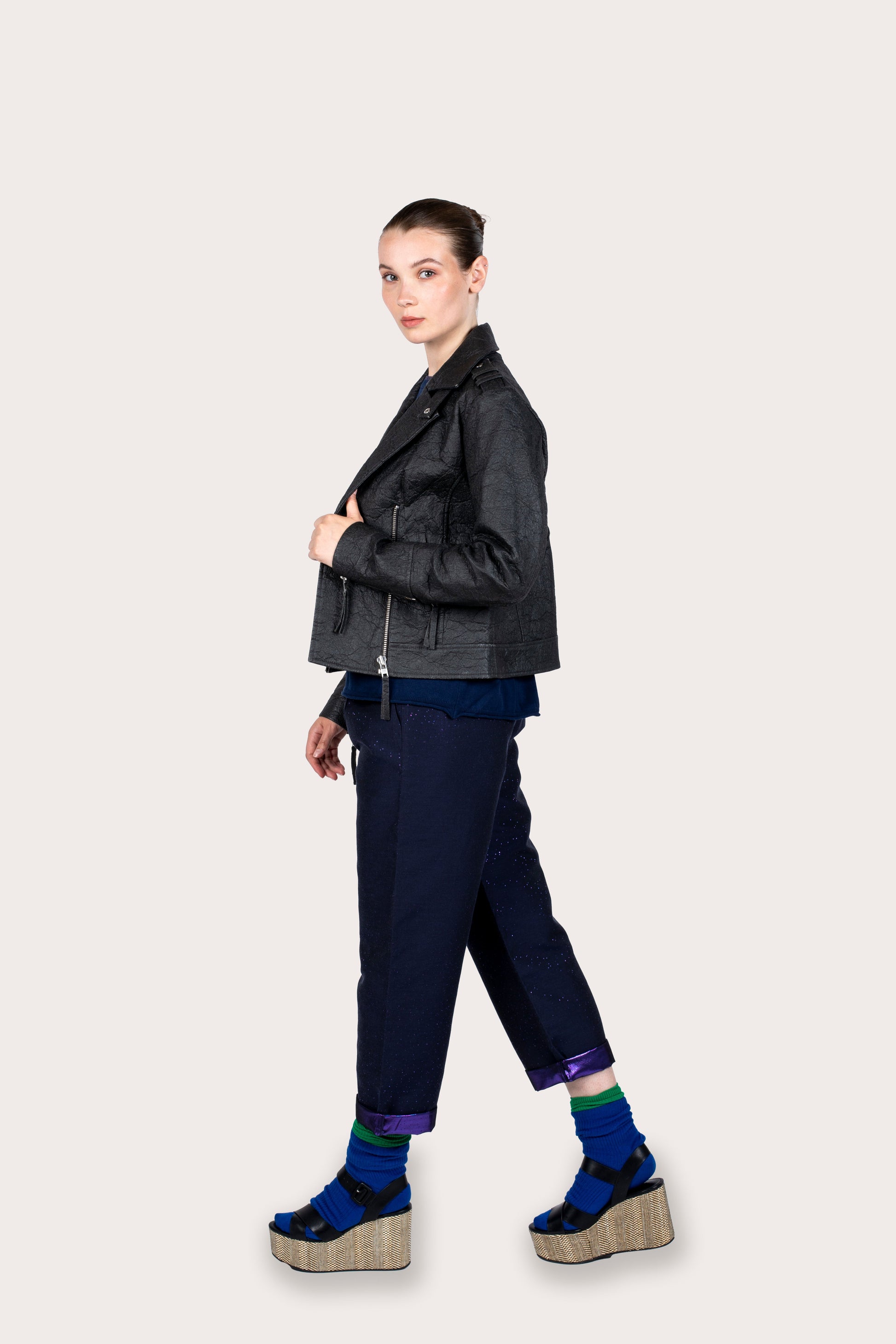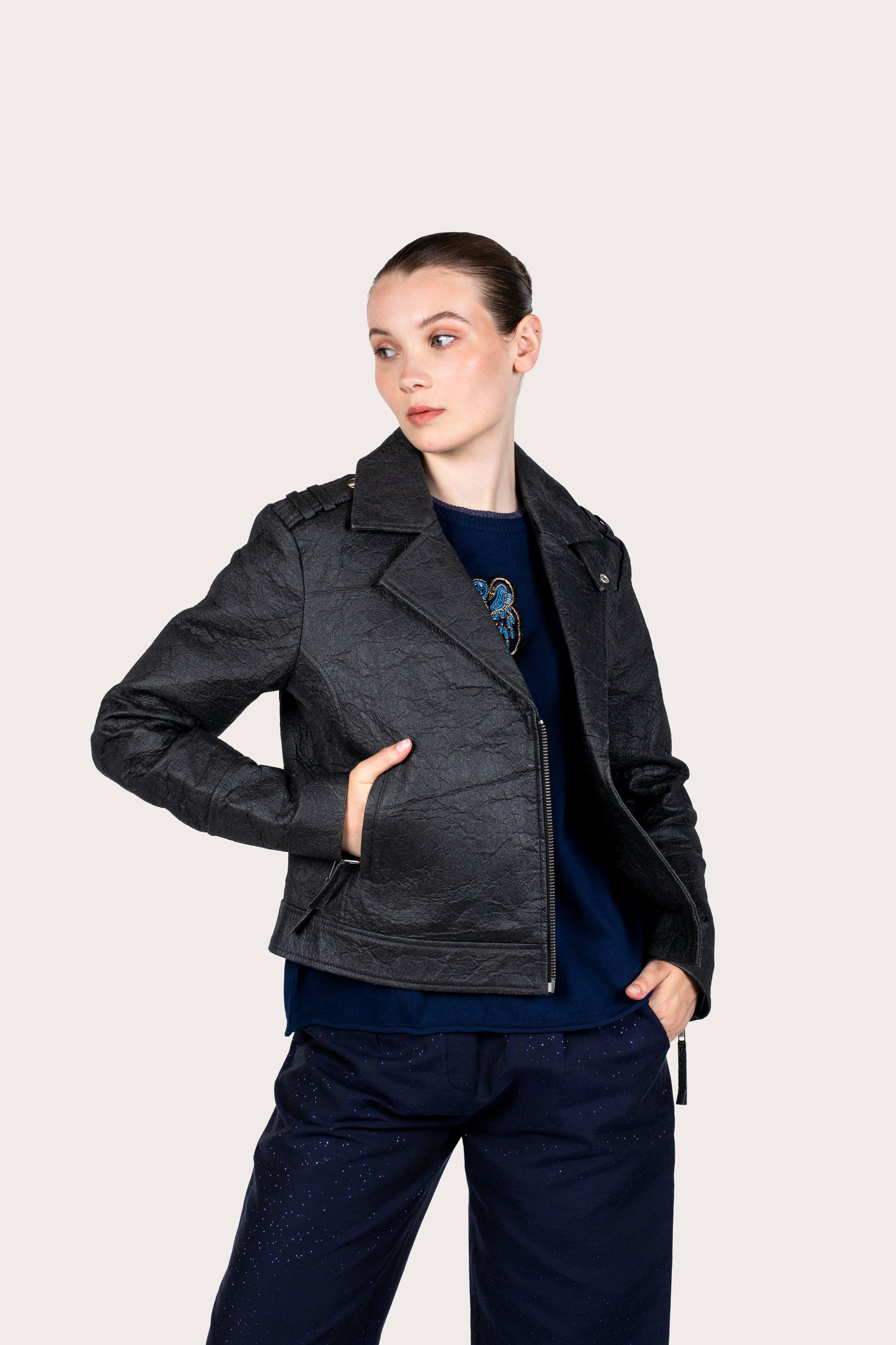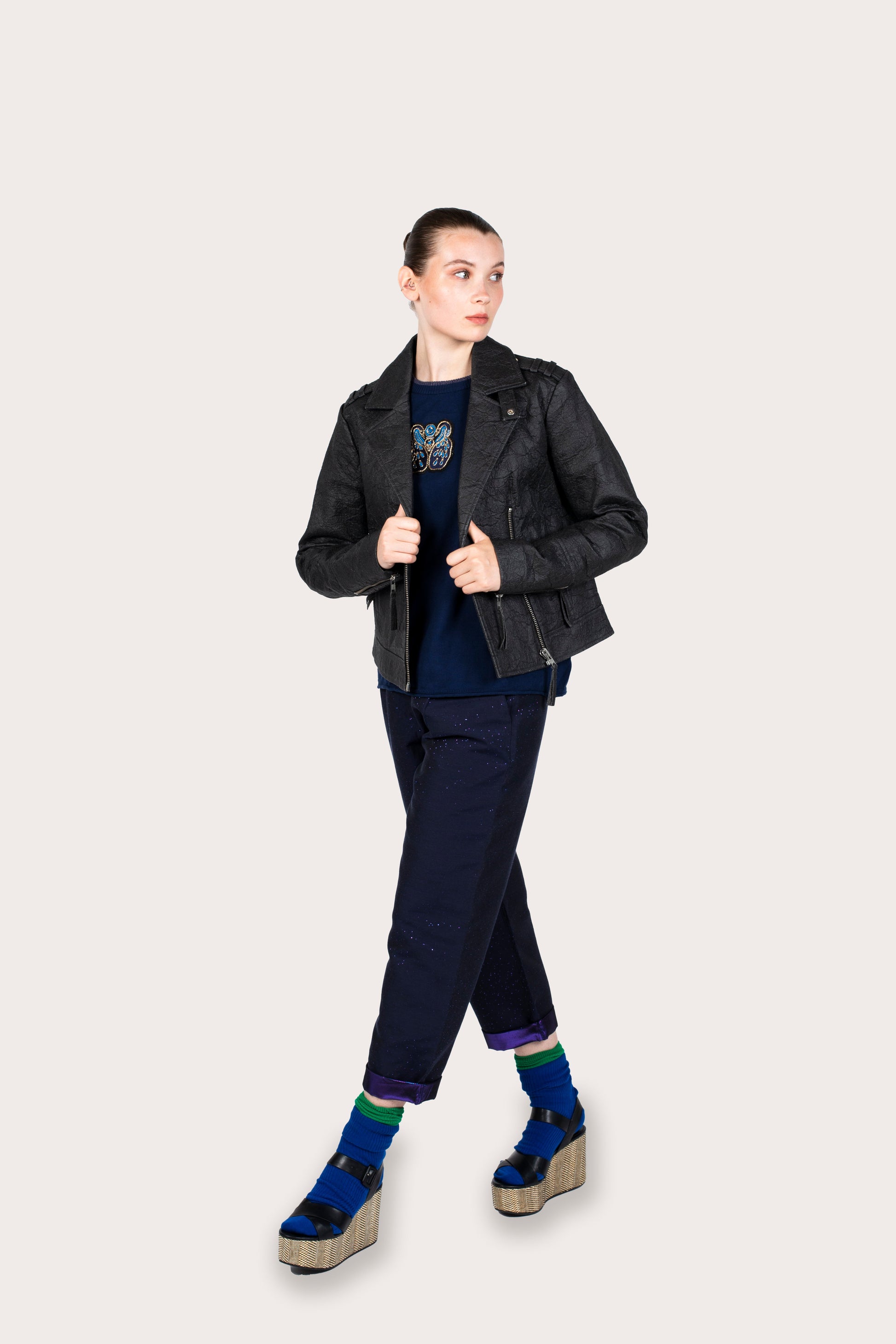 Le perfecto Ananas Charcoal est créé à partir de la fibre d’ananas, une matière végane à l’aspect de cuir, certifiée PETA. Les broderies, réalisées à la main, sont embossées dans la matière au dos de la veste grâce au savoir-faire ancestral indien.