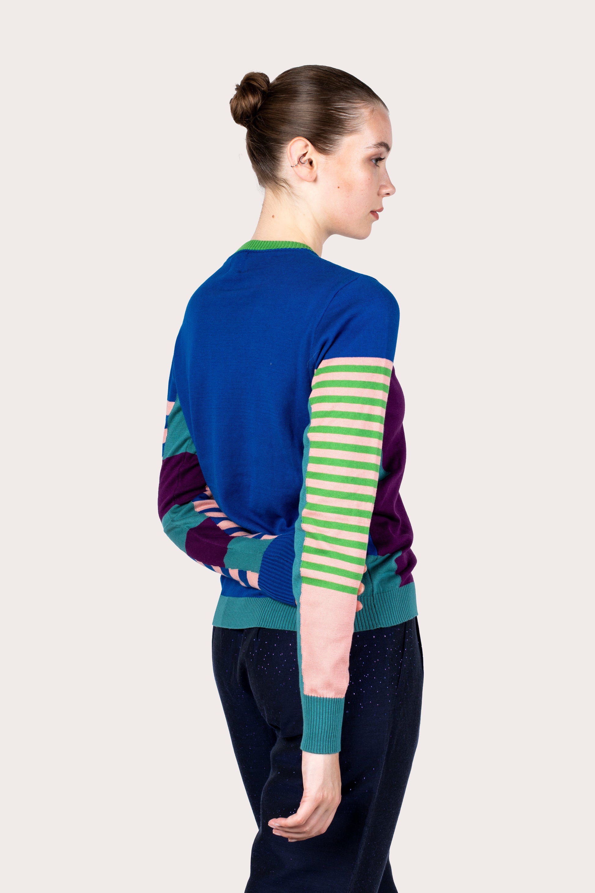Le pull Céline Blue, votre pièce préférée de la dernière saison, est de retour en stock ! C’est une parfaite revisite de la marinière Française, en version éco-responsable et stylée. Ses couleurs vives sont la preuve que la mode responsable n’est pas seulement classique. L’atelier Italien partenaire LO NEEL travaille avec des machines automatiques des années 70 pour conserver la beauté de l’artisanat. Le pull Céline Blue est fabriqué à partir de fibre de coton made in Italy recyclées dans les usines de maille à Prato. Dans une démarche upcycling, les pelotes sont créées à partir de ces fils destinés à être jetés. Porter le pull Céline Blue, c’est s’engager pour un monde avec moins de déchets et favoriser le commerce de la slow-fashion. Il s’assemble facilement avec tous les vêtements de votre garde-robe comme le pantalon CLEM, made in France.