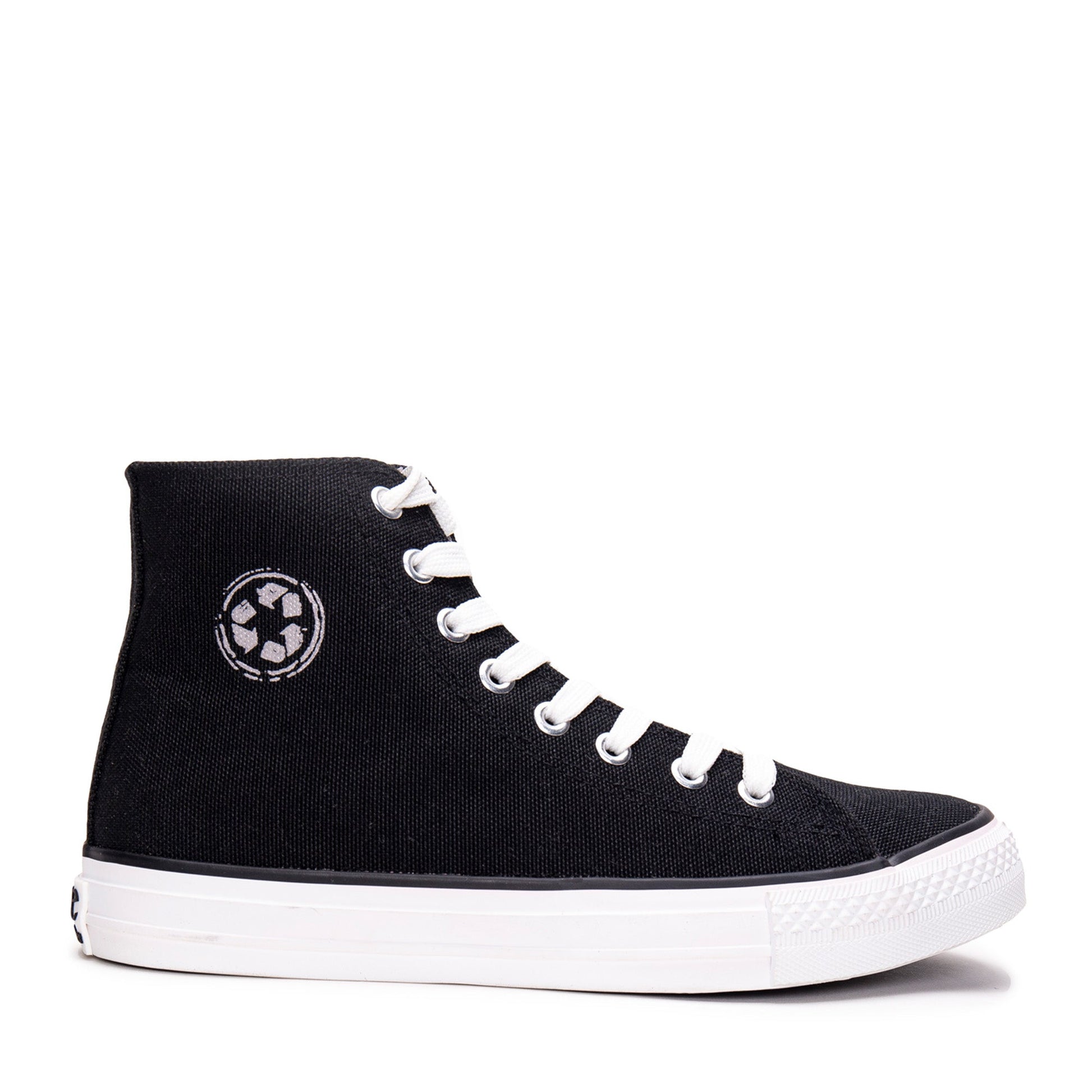 Explore Redo PET Black, the timeless unisex high-top vegan sneakers with non-skid vulcanized soles, crafted from Global Recycled Standard certified PET. These lace-up shoes embody sustainability, boasting a modern and traditional contrast design with a lightweight, sustainable fabric upper. Adorned with logos on the footbed, back heel, and tongue, plus a recycled symbol on the outer ankle, they prioritize movement with reinforced double-stitching and exposed sewn edges. Hypoallergenic and toxin-free, featuring a 100% organic cotton lining and lightweight, renewable organic rubber soles, they ensure breathability and antimicrobial protection, preventing odors.