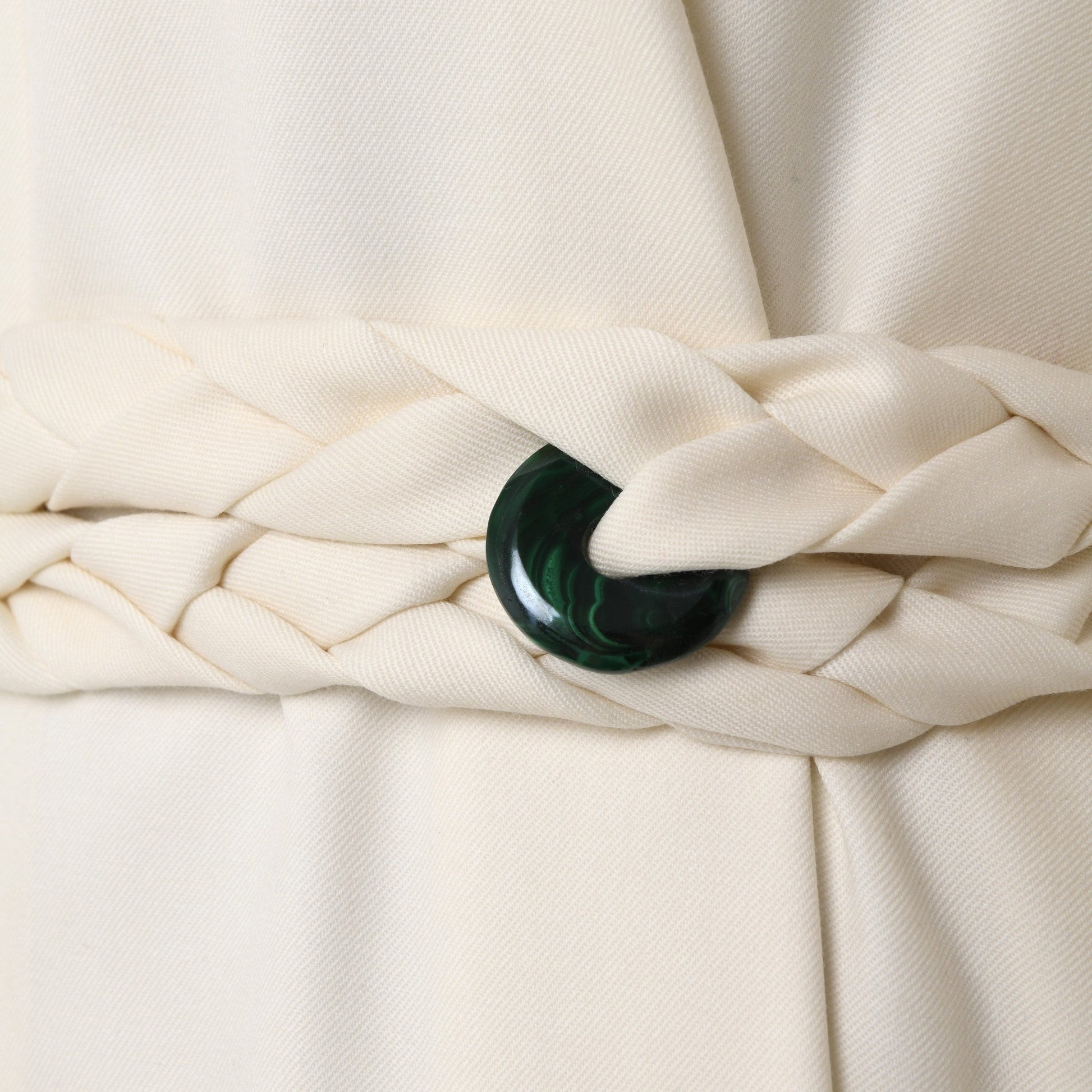 Robe longue col montant à épaulettes et plis, manches très évasées avec ceinture amovible en 100% laine et malachite