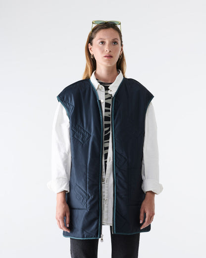 La veste doudoune longue MILLA, réversible vert bouteille/bleu, vous garde au chaud tout en étant déperlante. Parfaite en sous-couche ou portée seule, elle offre un confort optimal avec ses poches pratiques et ses matières recyclées. Une solution fonctionnelle et éco-responsable pour les mi-saisons.